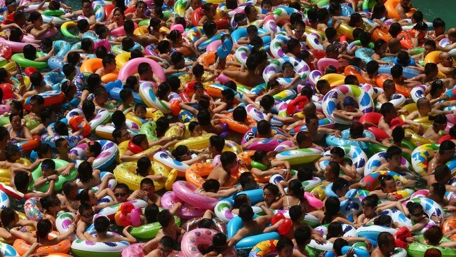 En lice pour un espace dans l’eau: Les gens se refroidissent dans un parc de l’eau dans le Sichuan, sud-ouest du pays, pendant une vague de chaleur 25. Juillet 2014